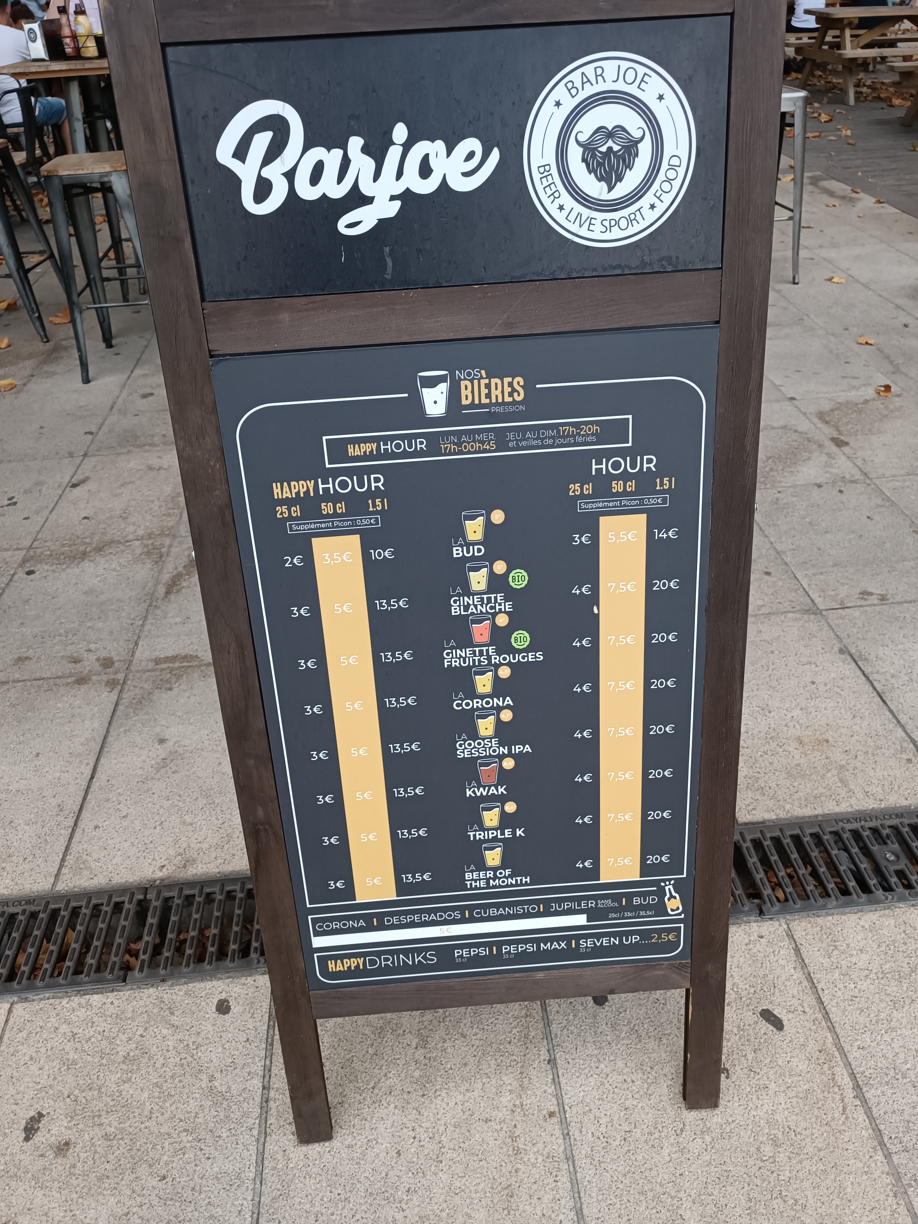 Posté le 15/05/2023 à 22:47"Ça a bien changé le barjoe... L'équipe aussi ... Pas aimable, on avait l'air de déranger les serveurs ... Trop occupés à draguer des clientes et se marrer entre collègues... donc un Bar vide, mais bien 5 minutes pour prendre une commande. (Ce ne sont pas des serveurs alors mais que des barmaids ? Car 0 service, même pas débarrasser, notre table déborder de verres) 22h30 la terrasse est rangée de toutes les tables et chaises, on a l'impression d'être mis dehors. 90€ dépensés et pas un sourire en retour 👍 Pas très pros les gars... Bref nous sommes déçus, ça ne donne pas envie de revenir, l'ambiance était bien mieux avant .. Nostalgiques des débuts !!!! Points positifs : bières bonnes, abordables et plats corrects."
